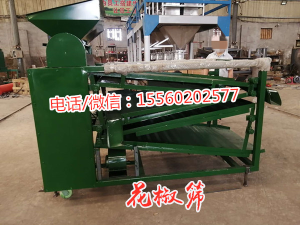 使用該機器可以把花椒中的籽、桿、葉、塵土等雜質分別清選出來,同時分出花椒顆粒等級,取代繁重的人工清選勞動。花椒清選機是專用于花椒脫粒、清選、分級、去雜的機械。 花椒篩選機及其他配套設備(提升機、皮帶機、絞龍、螺旋輸送機等)用途和特點:本機下方設有風機,可將從篩面流下的椒籽和花椒進一步風選分離,使篩凈率大大提高。